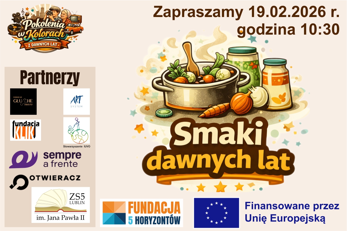 Już 19 marca 2026 roku odbędzie się kolejne wydarzenie w ramach projektu „Pokolenia w kolorach dawnych lat”. Tym razem uczestnicy spotkają się przy wspólnym gotowaniu podczas wydarzenia „Smaki dawnych lat – kulinarne spotkanie pokoleń”.